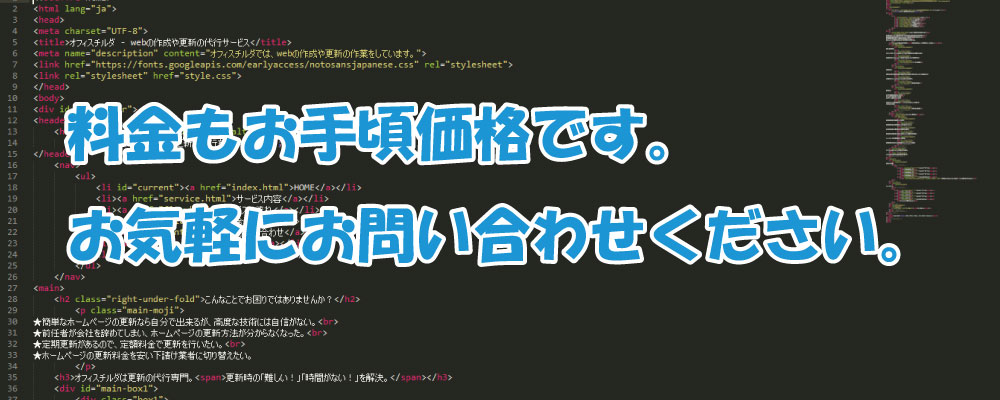 オフィス・ニシカは個人事業者としてホームページ制作を提供いたします。 少ない予算で最大の効果を発揮できるようにとにかく安価な料金でというのをモットーに頑張っております。安くてもクオリティーは落としません。まずはお見積もりから・・・